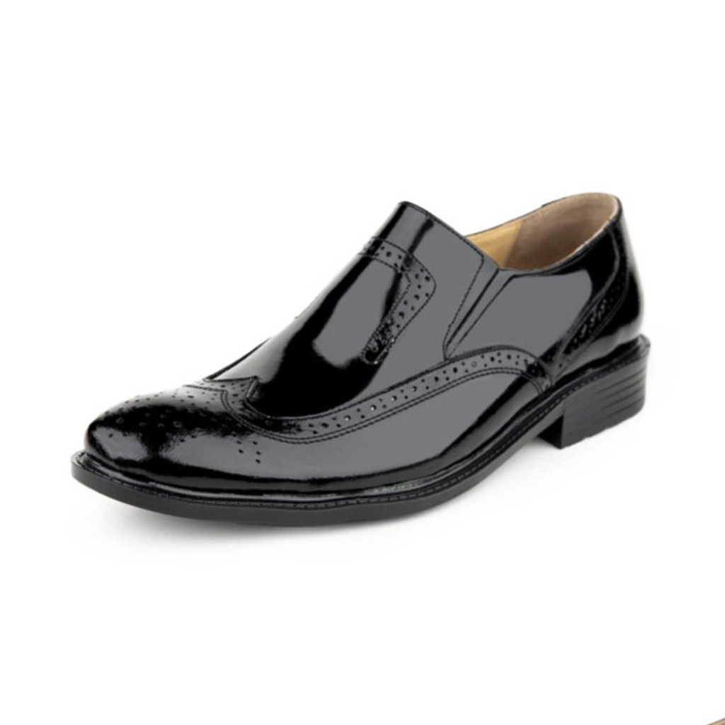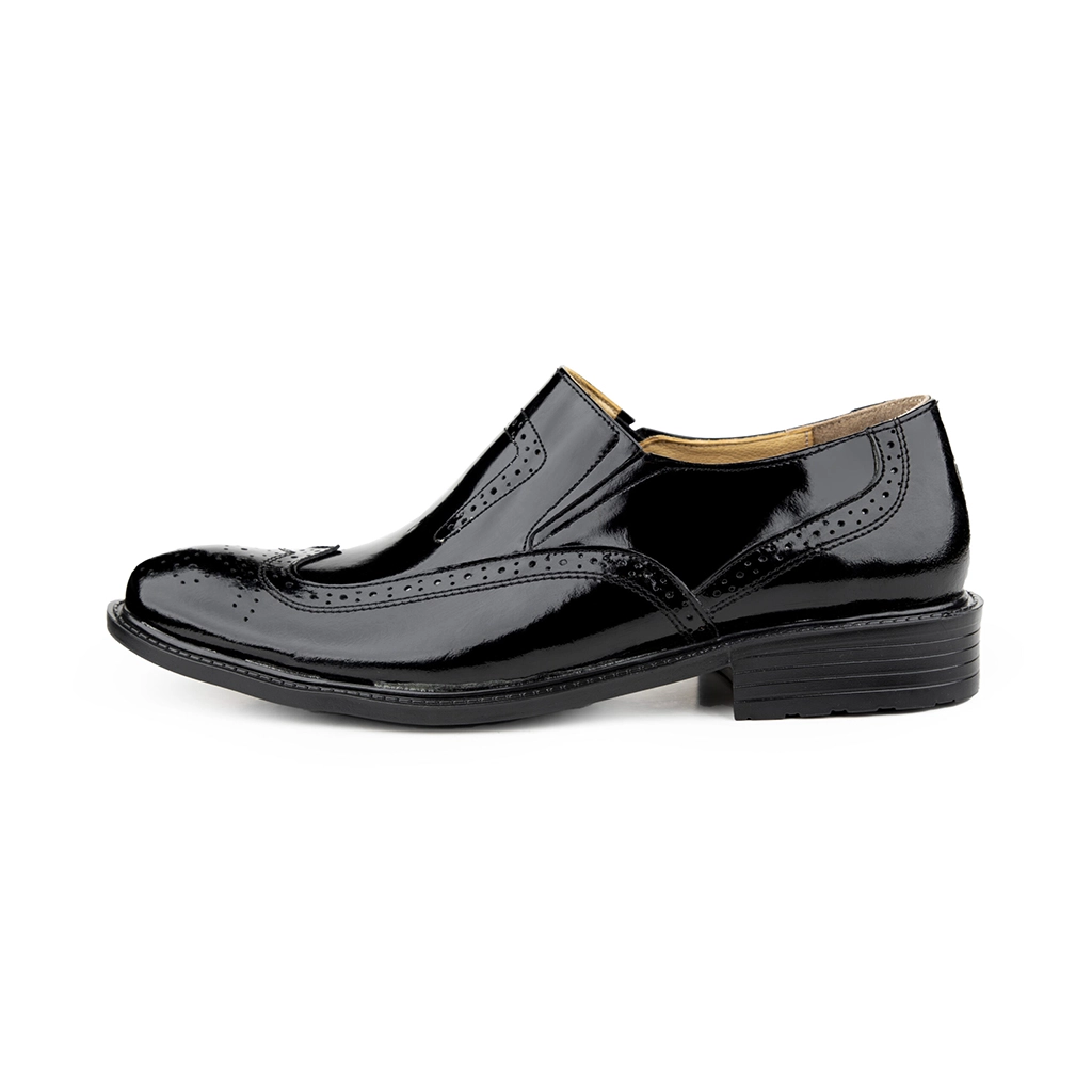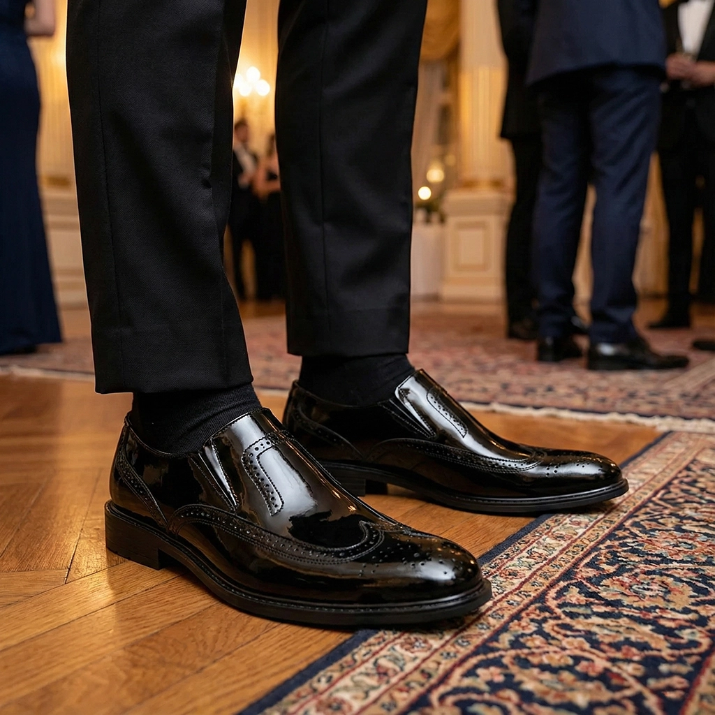 مشکی ورنی (Patent Leather): ساخته شده از چرم گاوی با پوشش لاکی و براق. این مدل، شاهکار مجالس است. درخشش ورنی زیر نورپردازی تالارها، استایل شما را متمایز میکند و بهترین گزینه برای آقا دامادها و ست کردن با تاکسیدو است.